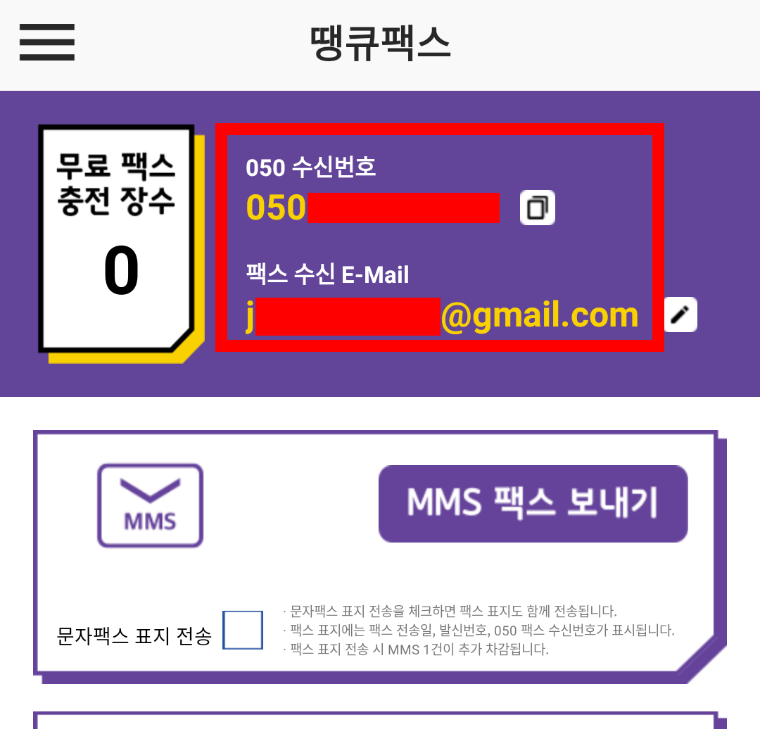 땡큐모바일팩스★문자팩스 런칭! 언제 어디서나, 휴대폰 문자메시지(MMS)를 통해 팩스 바로 전송! 050 팩스수신번호 무료 제공을 통해 편리하게 팩스 수신! [서비스 설명] ▶땡큐모바일팩스는 팩스 전송방식을 이용자가 선택할 수 있습니다. 첫째, 문자팩스 전송 - 문자팩스는 이용자의 휴대폰 문자메시지(MMS)를 통해 팩스를 전송합니다. 즉, MMS 문자메시지를 통해 팩스가 전송되며, MMS 전송요금은 이용자의 스마트폰 가입요금제에 따라 무료 제공건수내에서는