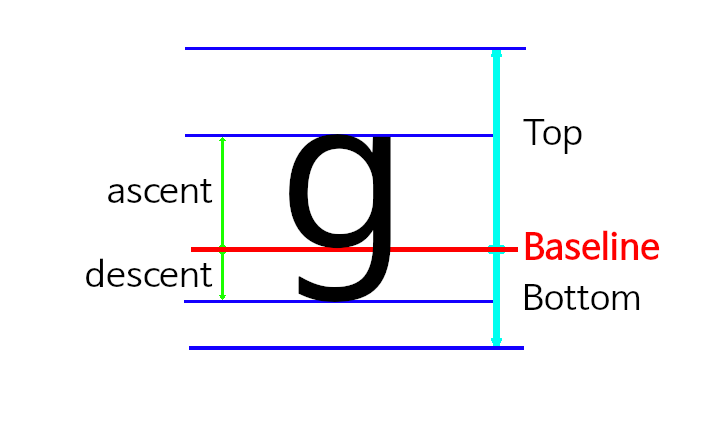 가장 중요한 선은 baseline(세로 기준점:y)이다, 이 baseline을 기준점으로 글자는 찍히게 되며, ascent, descent, top, bottom값은 이 baseline으로 얼마나 떨어져있는 지를 나타낸다.