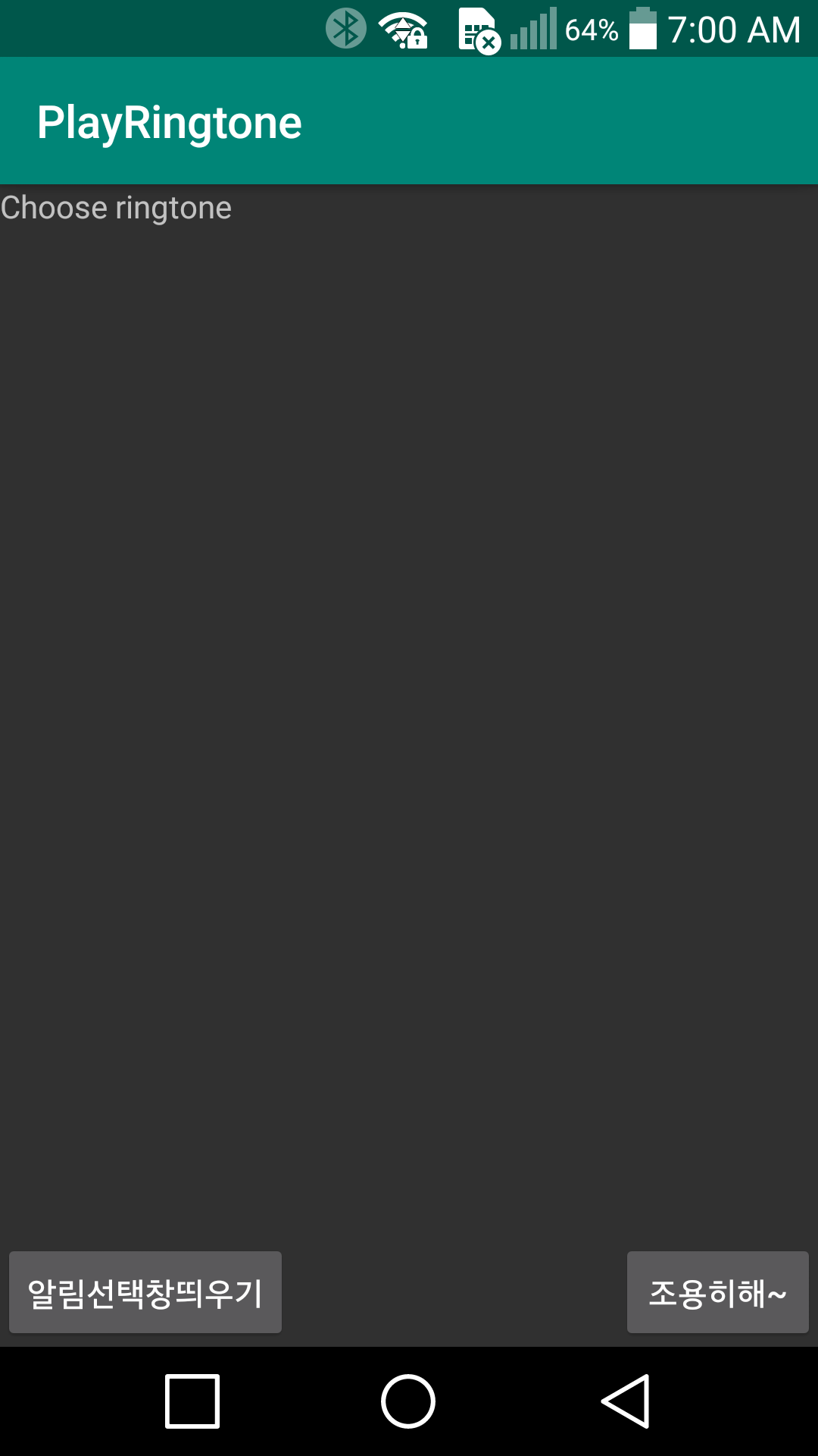 현재 선택된 링톤의 Uri를 표시하는 TextView, 알림 선택창을 띄우는 버튼, 알림이 울리고 있는 경우 멈추는 버튼, 총 3개로 구성되어 있다.
