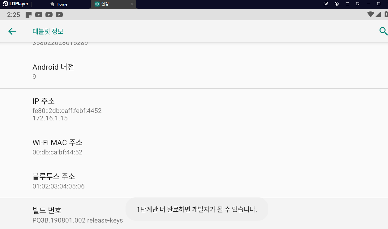 이 방법은 LDPlayer의 기능이라기 보다는 안드로이드 기기의 기본 기능이다. 안드로이드 4(Kitkat)부터(정확하지 않음)는 이 개발자 메뉴가 숨겨져 있다. 이 메뉴로 진입하기위해서는 기기정보[비스무리한 것]을 찾아보면 [빌드번호]라는 것이 보인다 이 것을 연타를 치면 [X단계만 더 완료하면 개발자가 될 수 있습니다.]와 같이 나오다가 [개발자가 되셨습니다.]라는 것이 나오면, 보이지 않던 개발자모드가 보이게 된다. 이 것은 이 [기기정보]와 같은 곳에 있지 않고,