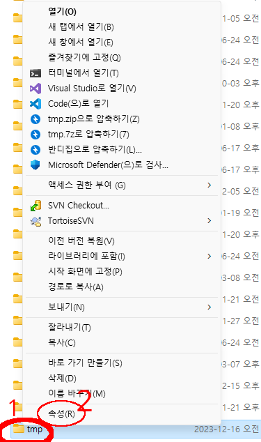 일당 해당하는 폴더에서 오른쪽을 클릭하여 속성창을 연다.