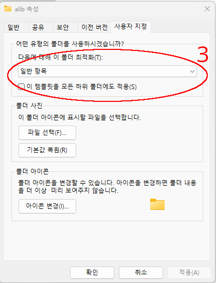 속성창이 뜨면 사용자 지정으로 가서 [다음에 대해 이 폴더 최적화]를 일반항목으로 바꾼다.