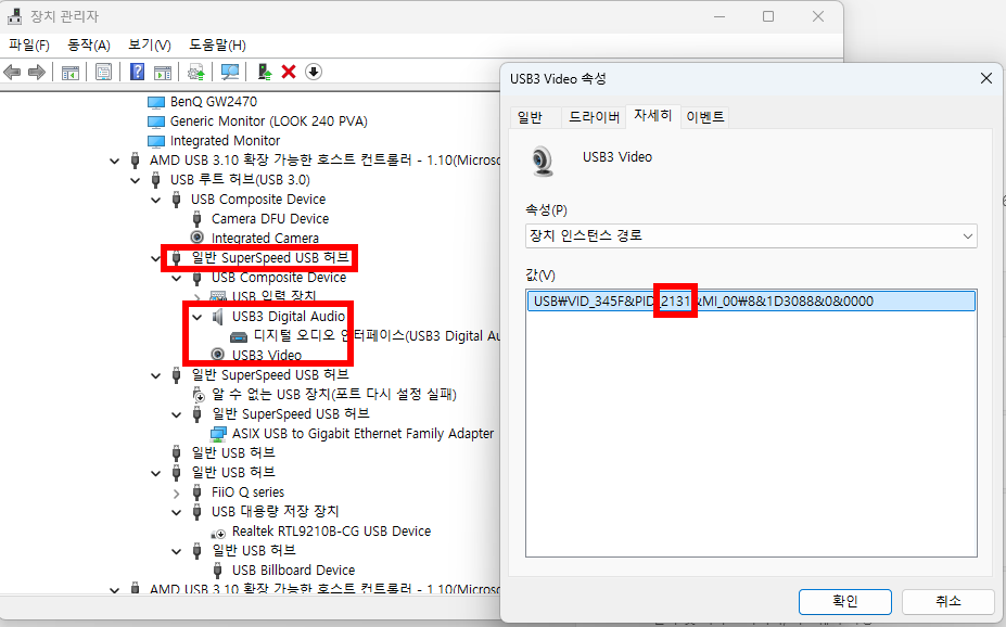 USB3.0(Super-speed USB)에 연결되어 있다. 드라이버정보에서 2131글자도 확인했다. 칩이 MS2131일 확률이 높아졌다.