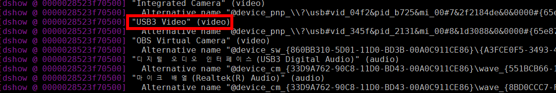다음의 명령으로 새로산 캡쳐보드의 이름을 알아내고.. 필자의 경우 "USB3 Video"로 나타났다.