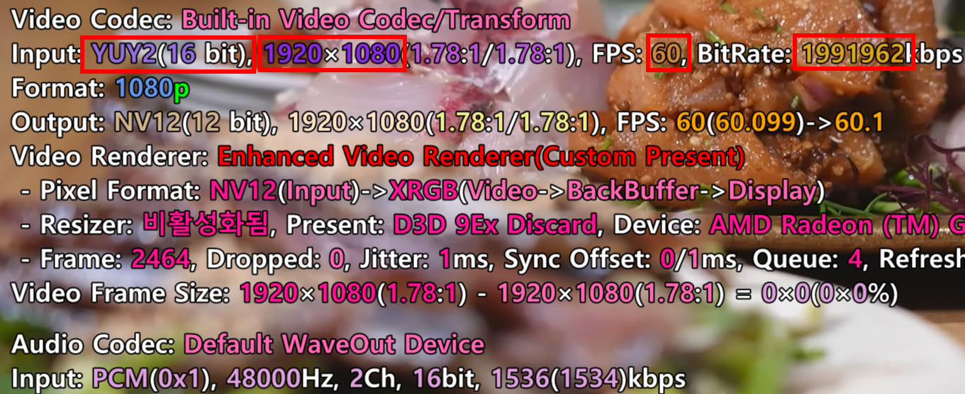 캡쳐하는 해상도에 따라 YUY2가 선택할 수 없는 경우가 있다. 위에 그림은 FHD, 60fps에서 YUY2가 제대로 보여지고 있다.