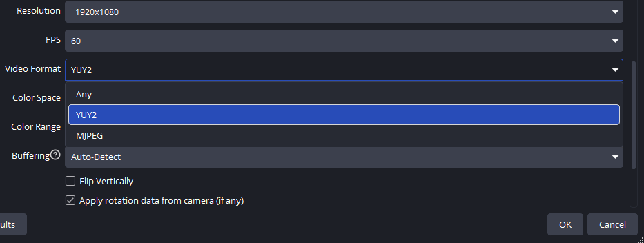 obs에서 장치를 등록하면서 YUY2옵션도 다음과 같이 확인할 수 있다.