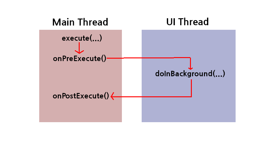 이 파라미터들은 doInBackground함수로 전달이 된다. doInBackground는 UI Thread가 아닌 다른 Thread[이하 작업Thread]에서 실행되면 나머지는 전부 UI Thread에서 실행된다.