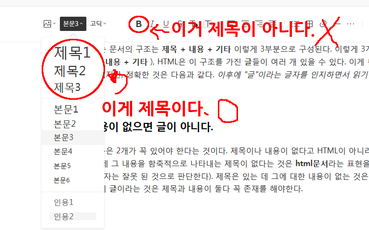 티스토리에서 제목을 넣는 법은 [B]를 선택하는 것이 아니고, [제목1~3]을 고르는 것이다.